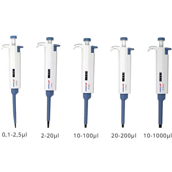 Volymer: 100-1000 µL | 20-200 µL | 10-100 µL | 2-20 µL | 0.1-2.5 µL