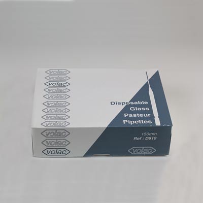 Pasteurpipetter i glas i en låda. Storleken på pipetterna är 150 mm. Begagnad men oöppnad låda. Okänt antal pipetter i lådan.